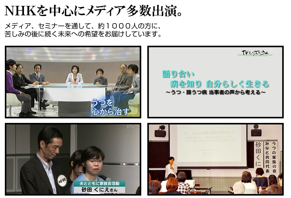 砂田くにえがうつの家族として失敗してしまった事を、ご家族にはもう決してして欲しくない!この思いから、家族はどうしたら心身共に健康な状態で、うつ本人により良いサポートをし続けられるか?その秘訣として「家族が知っておきたい5つのポイント」をお伝えしています。